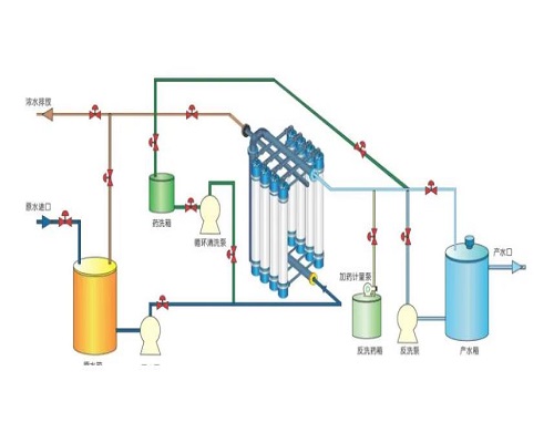 超凈水濾設備常見的工藝流程是:原水箱→預處理前置過濾器(石英砂、活性炭或者多介質過濾器)→加藥系統→軟化水系統→超濾膜→消毒殺菌→產水箱。