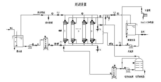 4. 化學(xué)清洗系統(tǒng):化學(xué)清洗系統(tǒng)一般由手動閥控制,化學(xué)清洗系統(tǒng)由清洗水箱、清洗泵、過濾器和攪拌加熱設(shè)備組成。當(dāng)超濾嚴(yán)重污染或跨膜壓差達(dá)到最高的標(biāo)準(zhǔn),化學(xué)反洗無法恢復(fù)超濾系統(tǒng)性能時,需要停機(jī)進(jìn)行化學(xué)清洗。